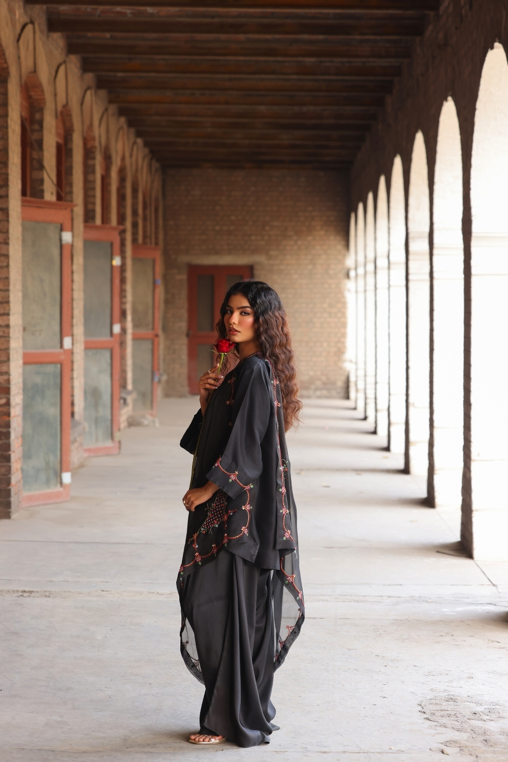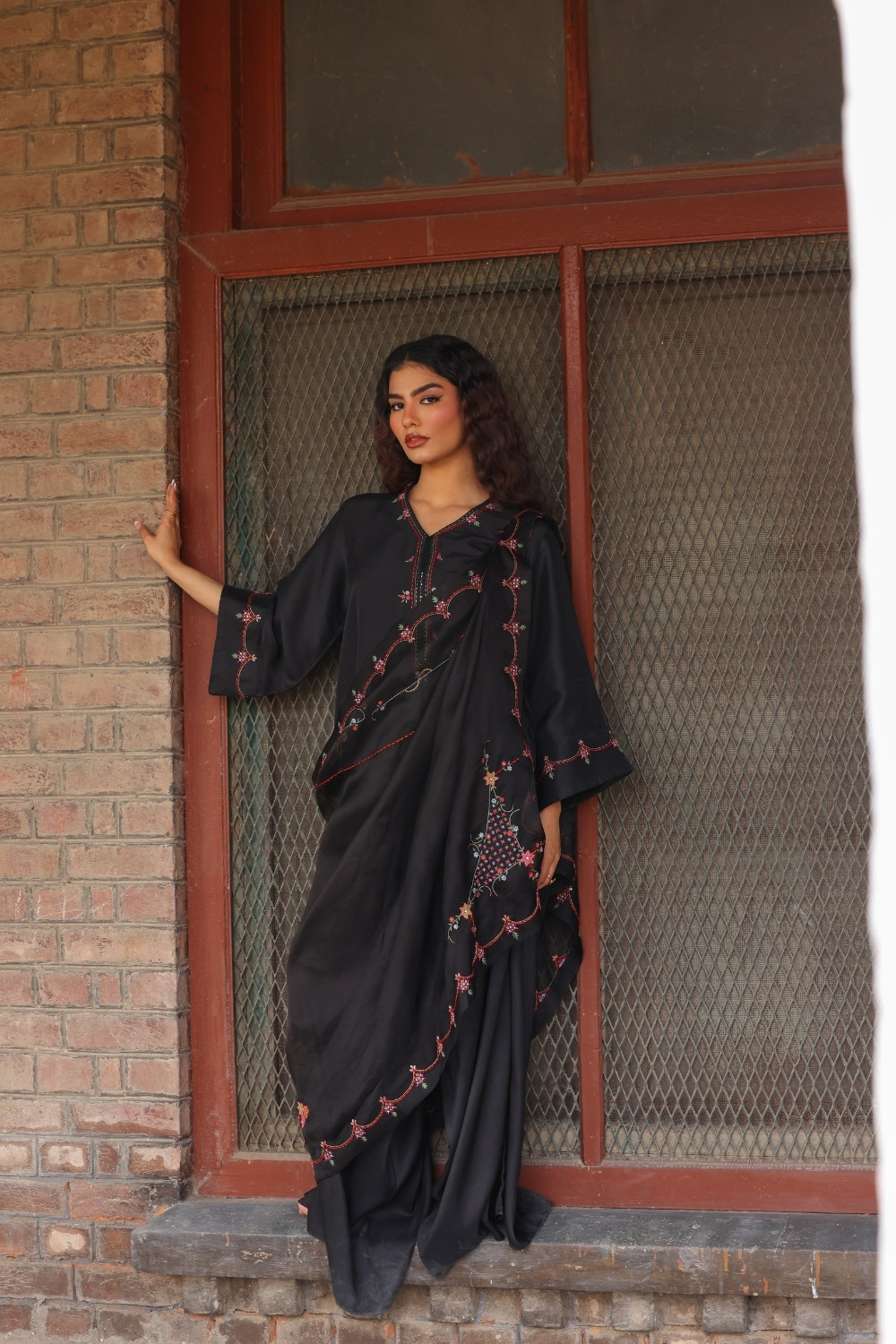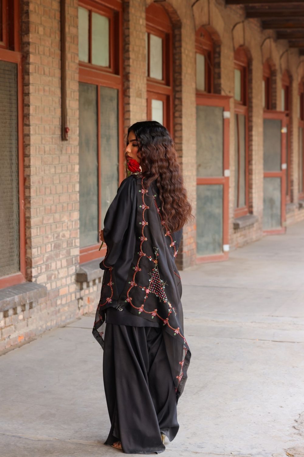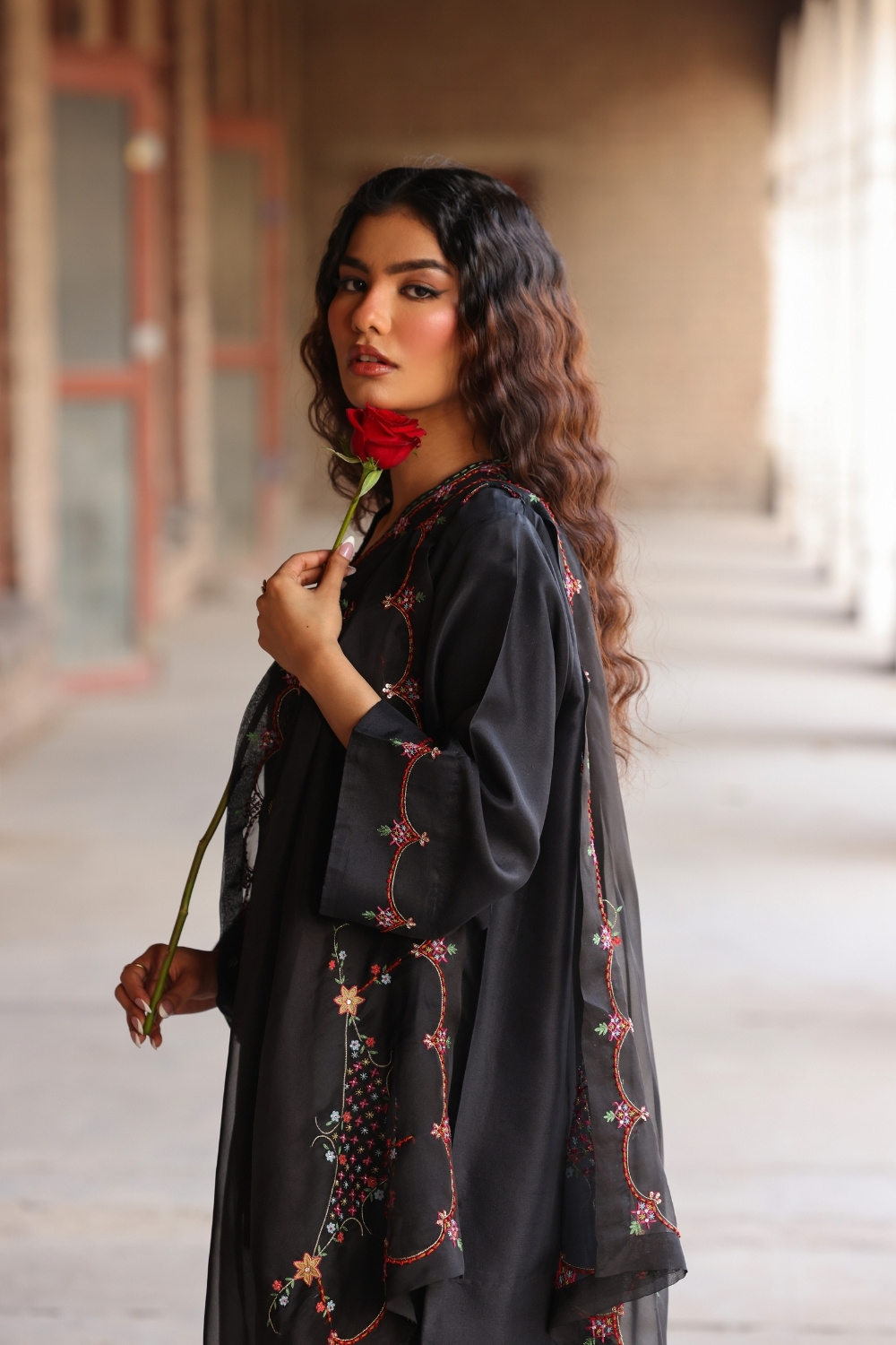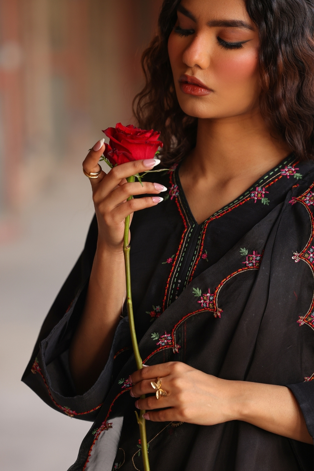 Crafted from rich 80-gram raw silk, this black ensemble is bold, commanding, and effortlessly refined. The neckline and sleeves bloom with striking hand embroidery in burnt orange and deep crimson — like embers glowing against midnight. Every stitch feels intentional, every detail unforgettable.