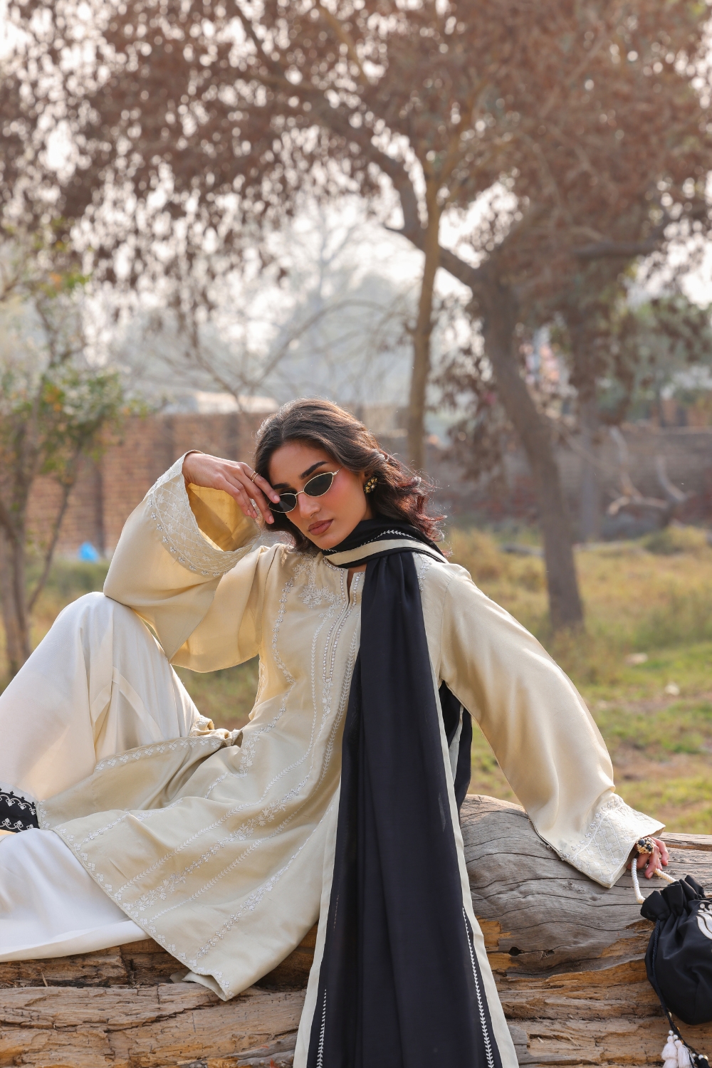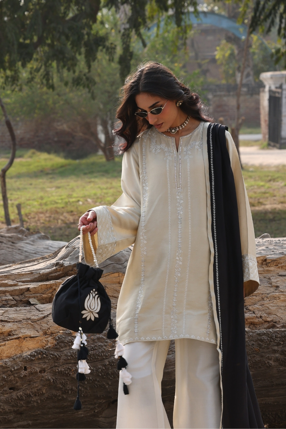 The ensemble is elevated by a dramatic black Chanderi dupatta, a bold contrast that frames the look with authority. Finished with hand arri embroidery along all four borders and ornate corner bunch motifs, the dupatta drapes like a statement—luxurious, timeless, and commanding.
