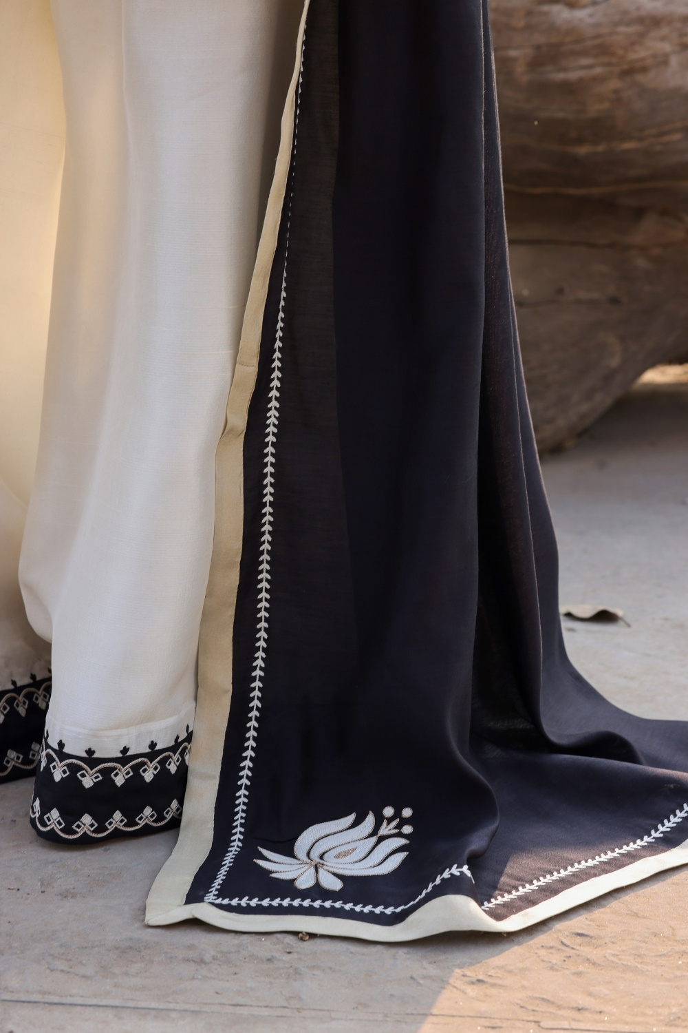 Completing the look are off-white raw silk pants, detailed with a striking black embroidered border patch at the hem, offering a sharp, contemporary finish.