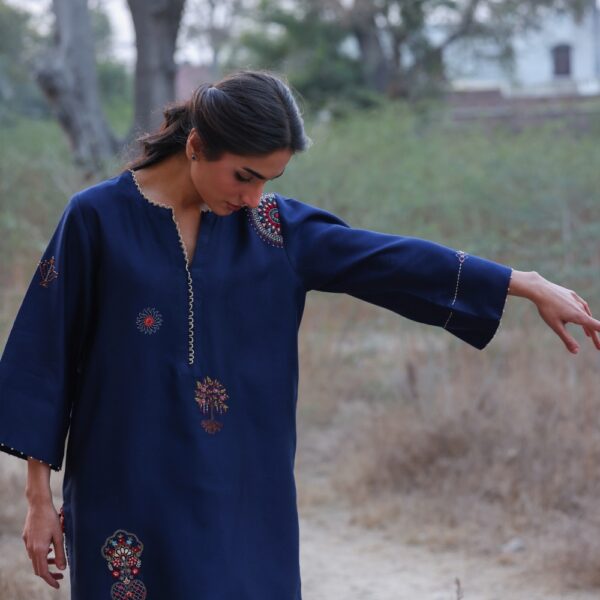 The shirt features a double front panel enhanced with neat pleats, and is delicately embroidered along the daman and sleeves in a beautiful mix of Swarovski sparkle and resham threads. Subtle wave-like and floral embroidery add movement and charm to the design.
