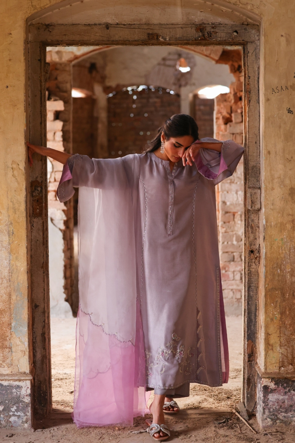 Nisha is soft, ethereal, and effortlessly elegant—a long 80-gram pure raw silk shirt in a dreamy lilac-grey tone, designed to capture quiet sophistication. The daman features embroidered panels, with a delicate central embroidery bunch and a subtle butterfly motif, blending geometric and floral designs in off-white, lavender, and soft green resham threads for a refined, luminous effect.