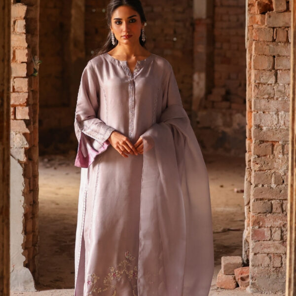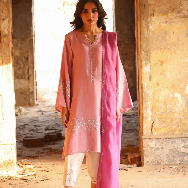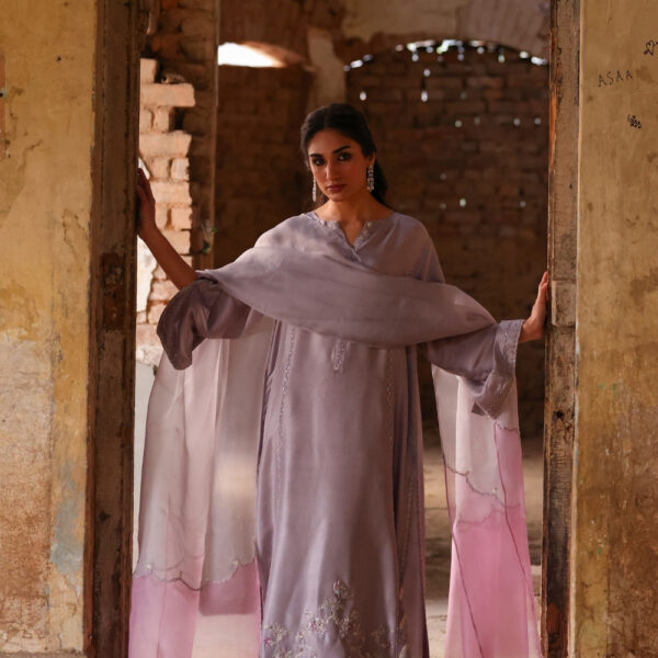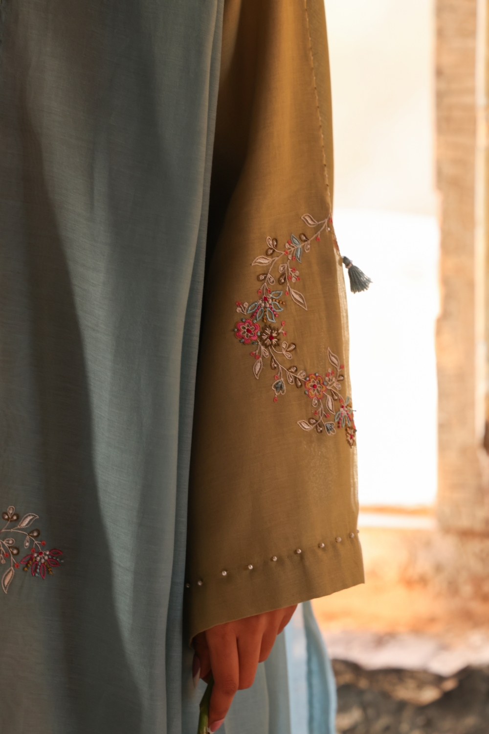 The true poetry lies in the contrast blue dupatta — a striking yet soothing companion. Crafted in airy kora cotton and elevated with exquisitely refined hath aari embroidery, its intricate motifs are placed with precision, almost like hand-drawn florals dancing across the fabric. The detailing is delicate, disciplined, and undeniably luxurious.