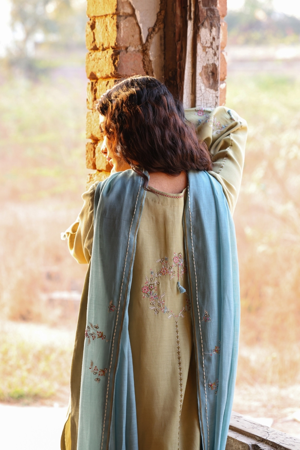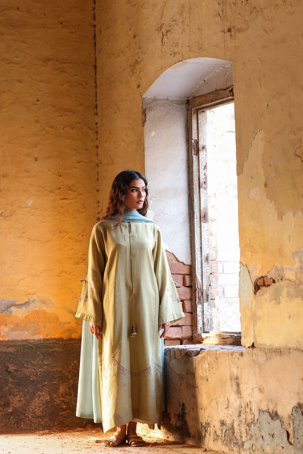 Rendered in pure kora cotton, this soft green ensemble feels like a quiet summer afternoon wrapped in fabric. The shirt flows with understated grace, adorned with delicately placed embroidery along the sleeves and hem — subtle yet deeply refined. Fine detailing runs along the neckline and back, adding that intimate touch of artistry that reveals itself in sunlight.